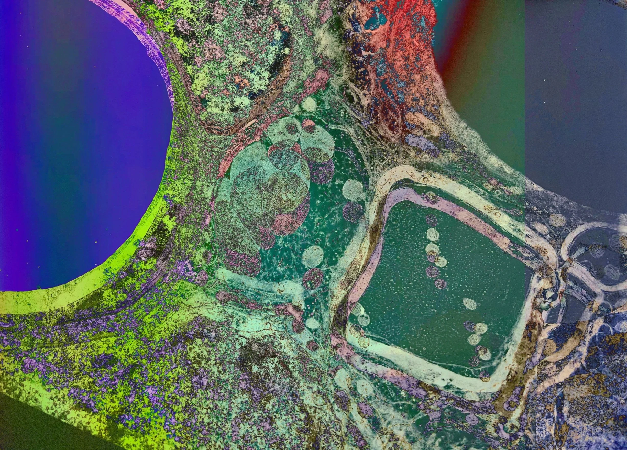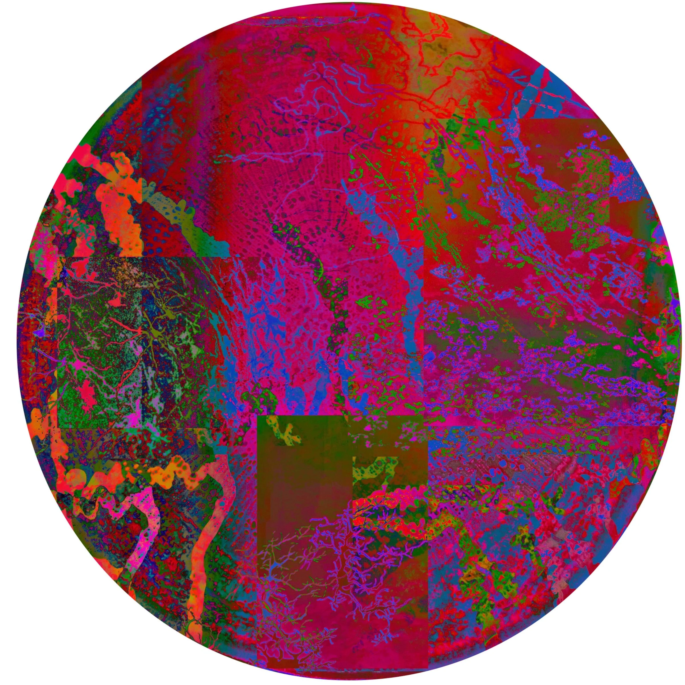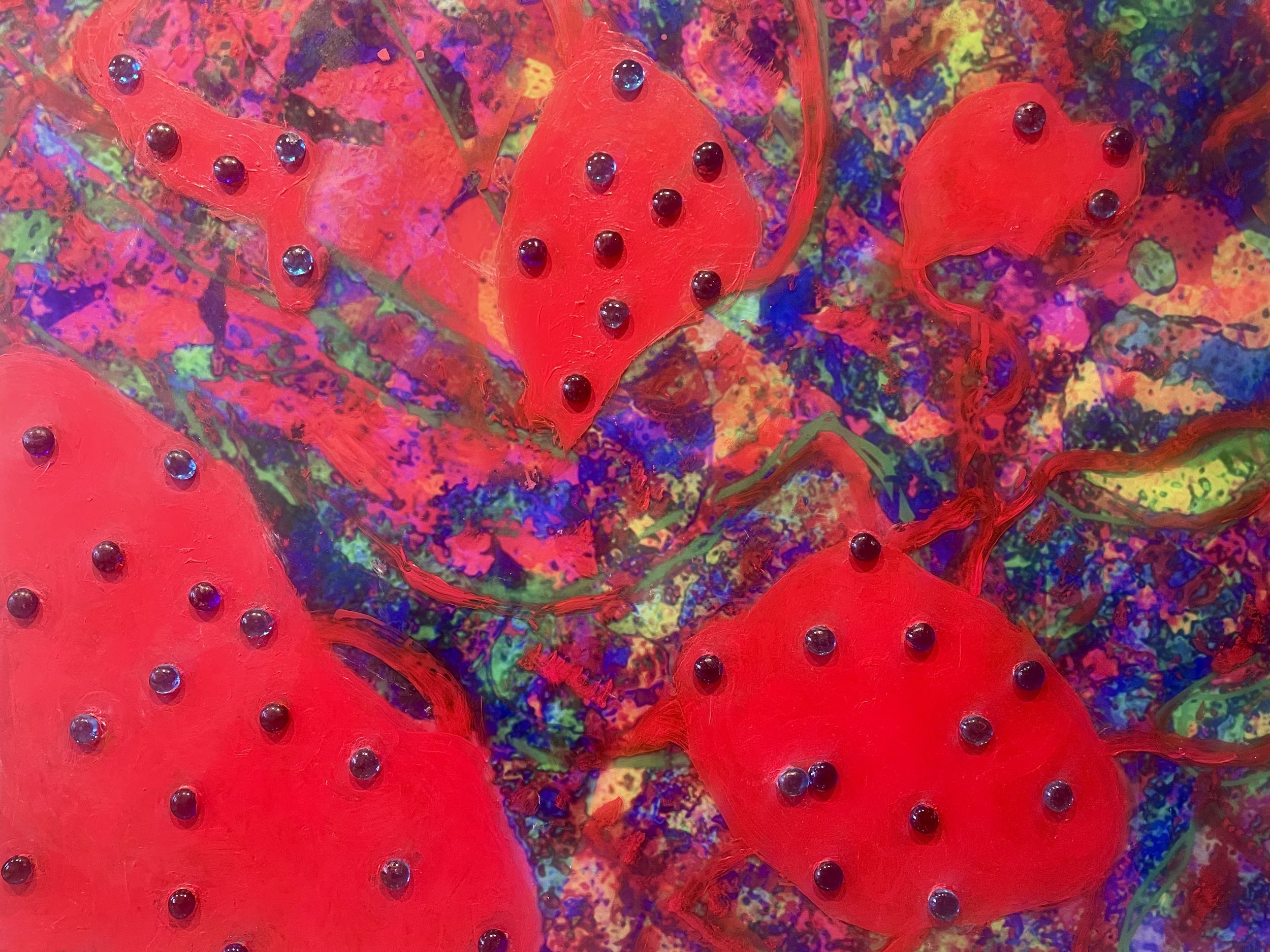 Works such as Maelstrom (33 x 44 in.), Meditation (33 x 44 in.), Beautiful in Color (44 x 44 in.), and Gravity (36 x 36 in.) explore the intricate structures of neural imagery as both microcosmic landscapes and metaphorical terrain. This shift in scale and material support extends my ongoing inquiry into how scientific imagery can be transformed into immersive, meditative visual experiences.